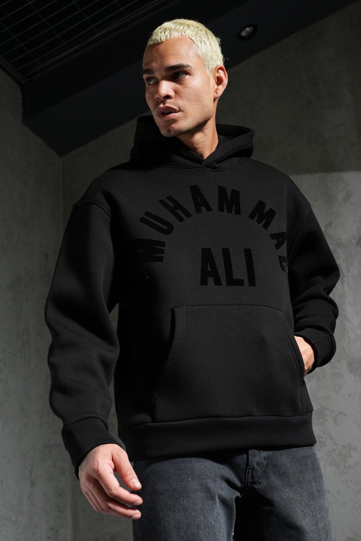 Sweat à capuche noir coupe oversize, fabriqué dans un tissu épais et doux pour un confort optimal et un tombé premium.