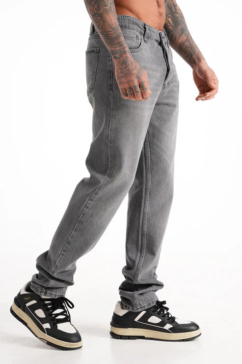 Jean gris coupe droite (regular fit) au style classique et polyvalent, idéal pour un look casual ou urbain. Doté de deux poches avant et deux poches arrière.