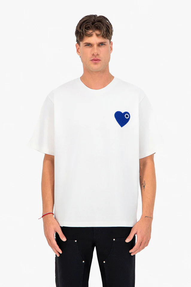 T-shirt en coton épais avec cœur en éponge brodé sur la poitrine. Une pièce simple, confortable et moderne, idéale pour un style minimaliste au quotidien.